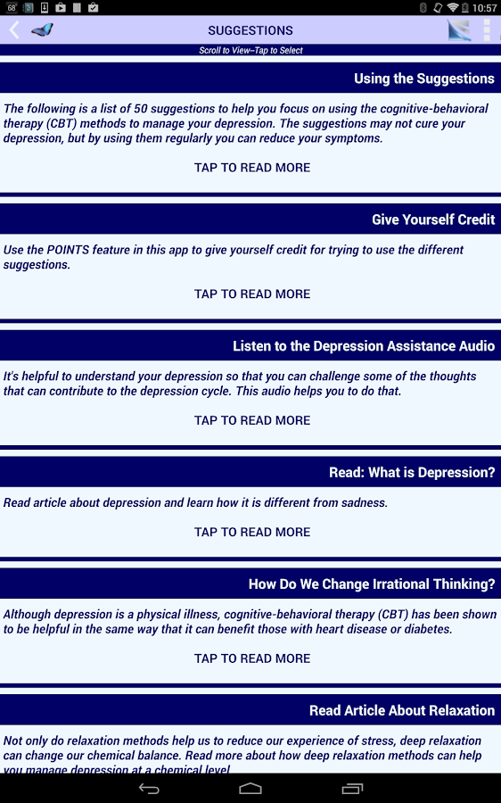 Engaging interface to help users learn better ways of coping with low moods and anxious feelings. Mental health and well-being apps are being used ever widely with users of all ages and mental health needs. Student developing smartphone app to prevent and treat anxiety and depression ... Fetch This Document