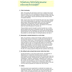 What Anyone Can Do When They Think Someone is Depressed • Offer help and listen • Talk about feelings • Know the symptoms (hopeless, helpless) • Find someone who can help (parent, teacher, professional) • Stay connected What School Professionals Can Do ... View Doc